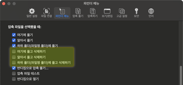 이러한 위험을 줄이기 위해, 반디집에서 원본 파일을 삭제하는 기능은 기본값으로 꺼져 있습니다. "압축 풀고 삭제하기" 기능을 사용하려면 아래의 스크린샷과 같이 환경 설정 > 파인더 메뉴 탭에서 해당 기능을 켜면 됩니다.